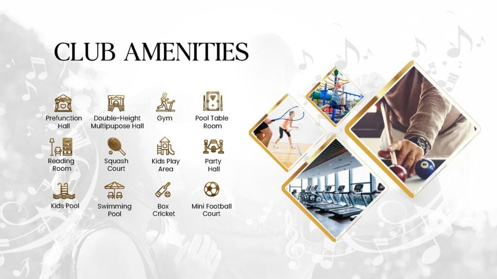 •⁠ ⁠Club House: 75000+ sqft ( 3 storey) with Glass Façade elevation